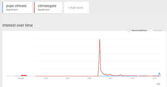 So, if you use Google Trend to get data on the concept of the "97% consensus" on climate, you find that the number of searches has been too small to generate a curve. Similarly, "climate consensus" doesn't generate a significantmemetic behavior. Apparently, people are not actively searching for an estimate of the number of scientists who are convinced that anthropogenic climate change is real. However, if you search Google for ("97% consensus" climate), you get more than 350,000 results. That compares not so badly with "climategate ", producing 570,000 results. Then, if you look for "Pope climate change," you have 25 million pages and "climategate " fades away in the distance.
